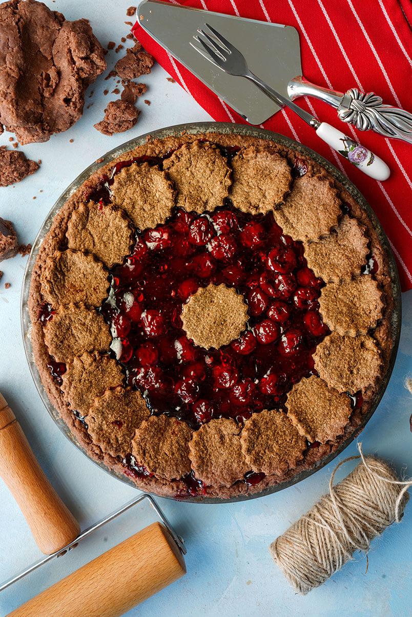 If you decide to go for a standard pie, cover with the smallest disk, trim the excess dough around the edges and press the top and bottom crust together with a fork so that the cake won’t split while baking. Otherwise cut the disc with your favorite cookie cutters and create your topping exactly as you like it. If you go for option two you might have quite some leftover dough and you might be able to bake a second small cake or some cookies.