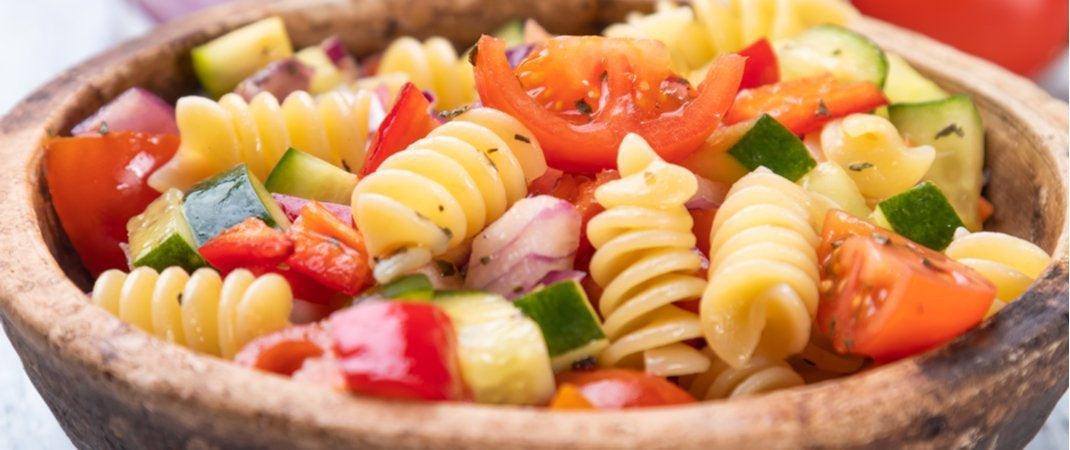 - In a small bowl, whisk together your olive oil, vinegar, mustard, basil, salt, and pepper for your dressing. Once you're satisfied with the taste, pour the dressings over your pasta and veggies, stirring well to coat.