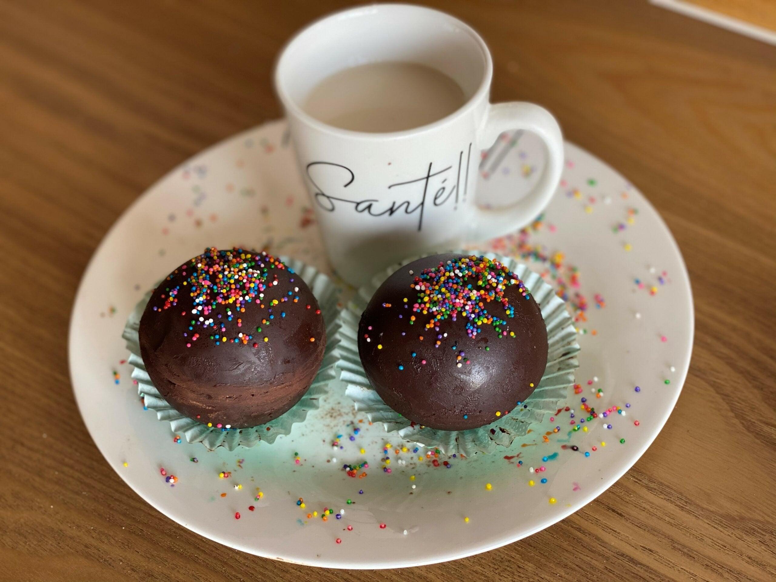 When you're ready to serve, place the chocolate bomb into a mug of hot non-dairy/plant-based milk and watch as your bomb slowly melts and opens up to reveal the chocolatey marshmallow treats inside. Stir, and enjoy!